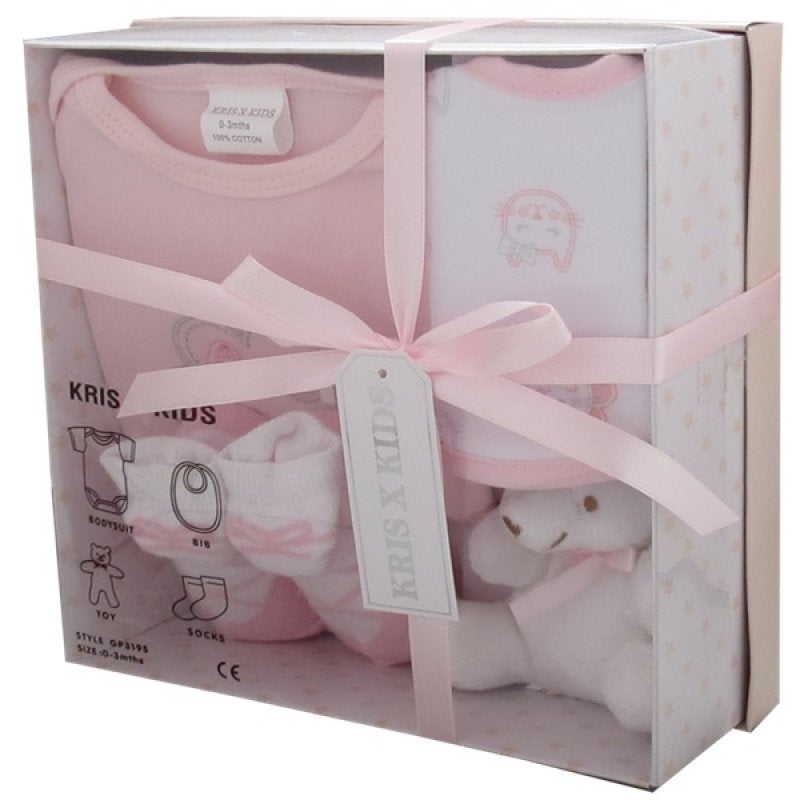 Set contains 1 x 100% Cotton Bodysuit, 1 x 100% Cotton Bib, 1 x Teddy and 1 x Pair of Socks